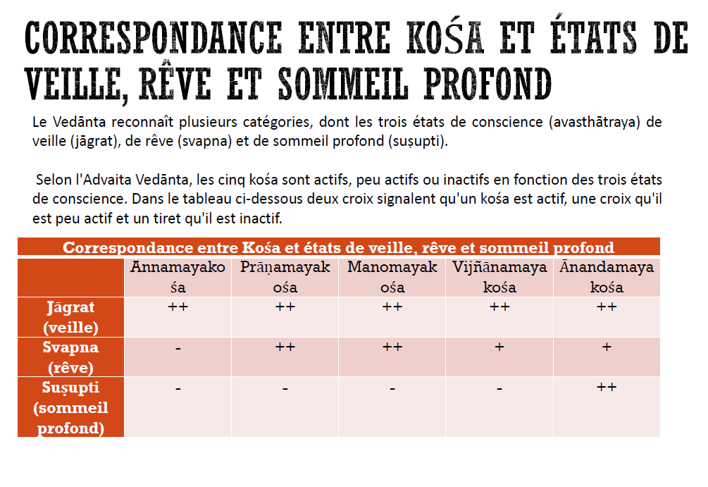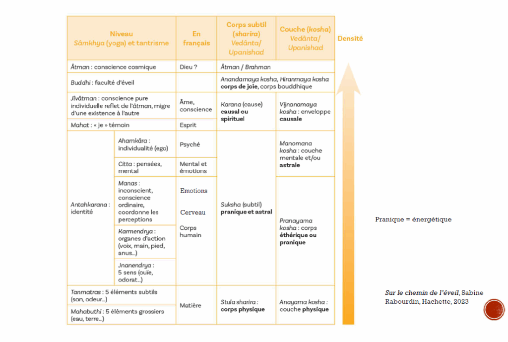 | 5. Ānandamaya kosha | Enveloppe de félicité | Béatitude, unité, paix intérieure | Samādhi, contemplation, abandon au Soi : le yoga comme union au Tout |